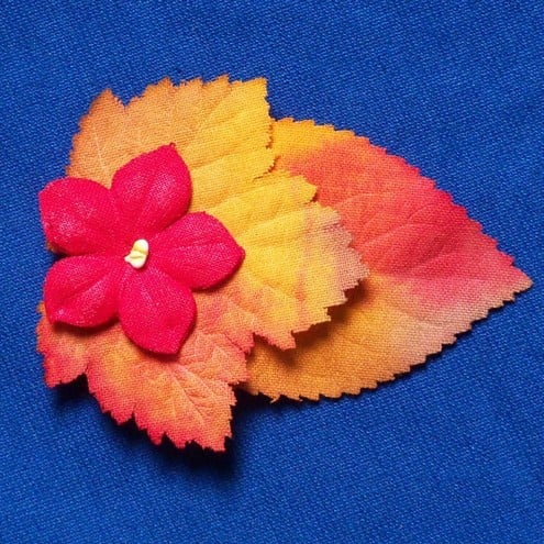 A soft, seasonal brooch in glowing autumn colours, assembled from cotton leaf and flower pieces. A perfect combination of the vintage and the hand-made.
