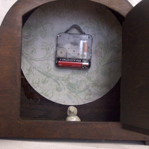 There is little heart on the front of the clock, and it's decotrated with soft to the touch ribbon, there is also contrasting vintage paper inlay either side of the clock face. There is a door on the back and there's a little bird hiding inside!