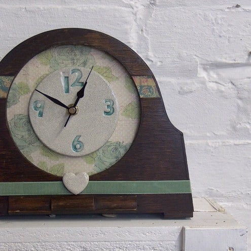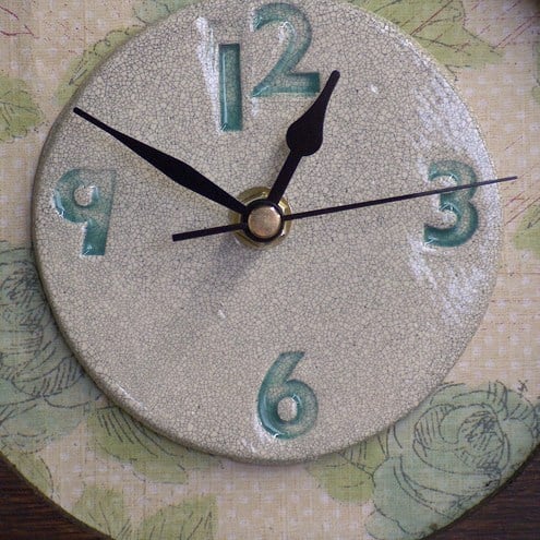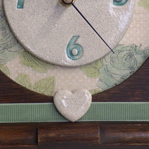 Would you like to re-home a tired, broken old clock that's been given a new life? This is a vintage wooden clock case, enhanced by my hand-made ceramic clock face with numbers stamped into the clay with my vintage stamps. The letters are coloured with a lovely, fresh green underglaze, the vintage style paper background is decorated with roses.