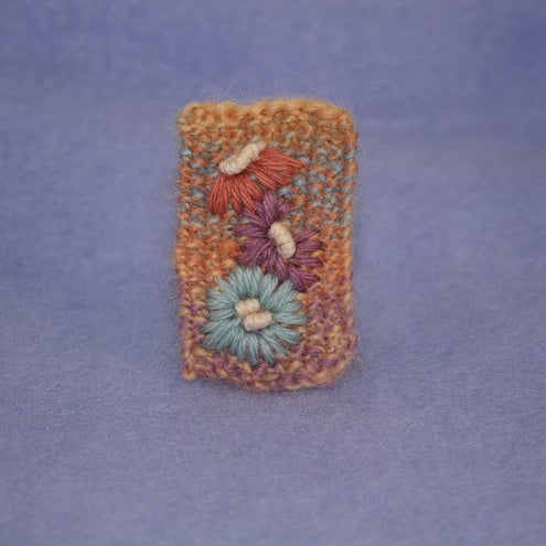 The background for this embroidery is hand knitted in a self-patterning, yarn. Moss stitch has been chosen to add texture to the design. The daisies are embroidered, in simple stitches, using tapestry wools, the colours chosen from the background palette.