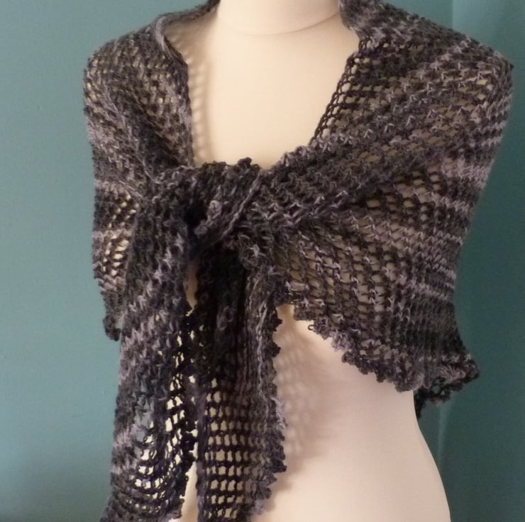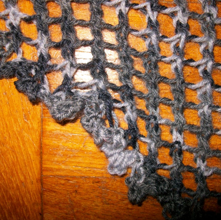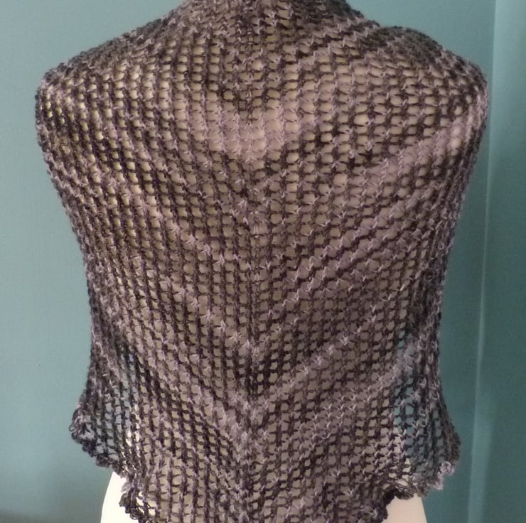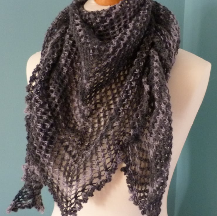 I have handknit this beautiful grey lace scarf in a 4ply sock yarn. It is a blend of 75% wool and 25% nylon. It is knitted with an all over lace pattern to give a light scarf with a lovely drape. It measures 64" point to point, and is 26" deep at the widest part of the triangle.