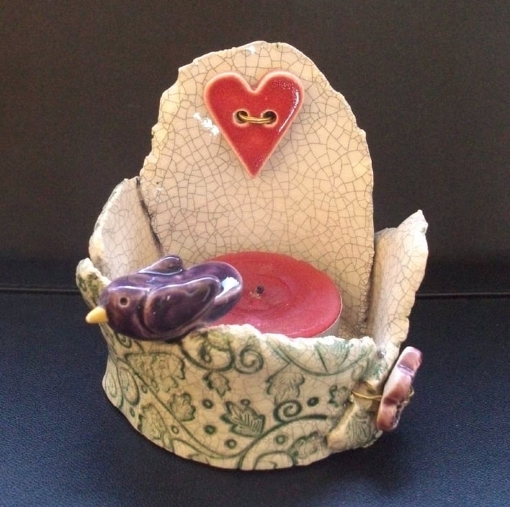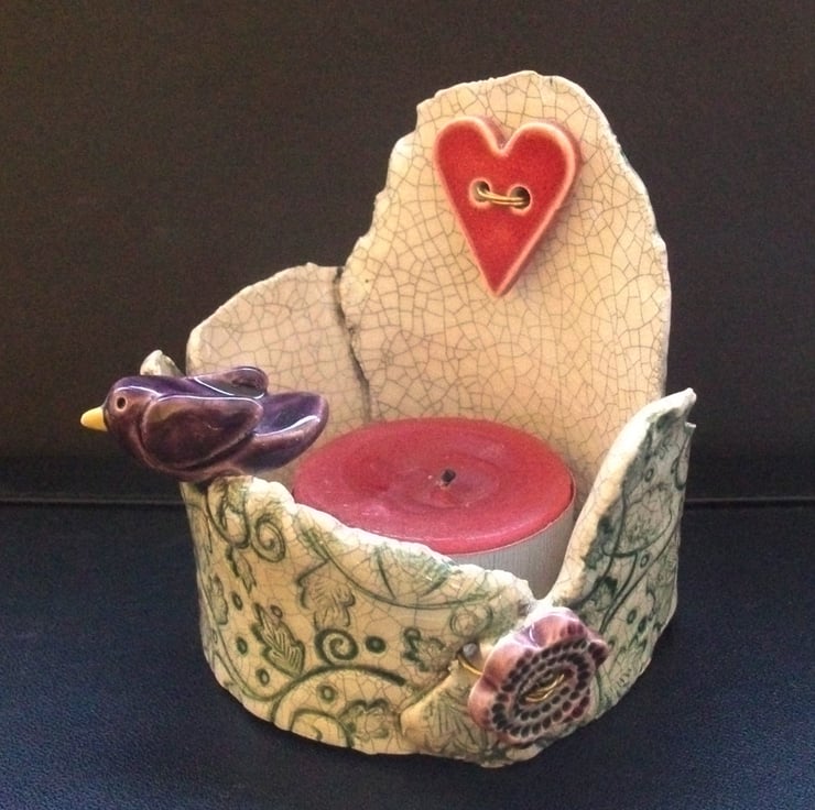 This cute little tea light holder is made from white earthenware clay.