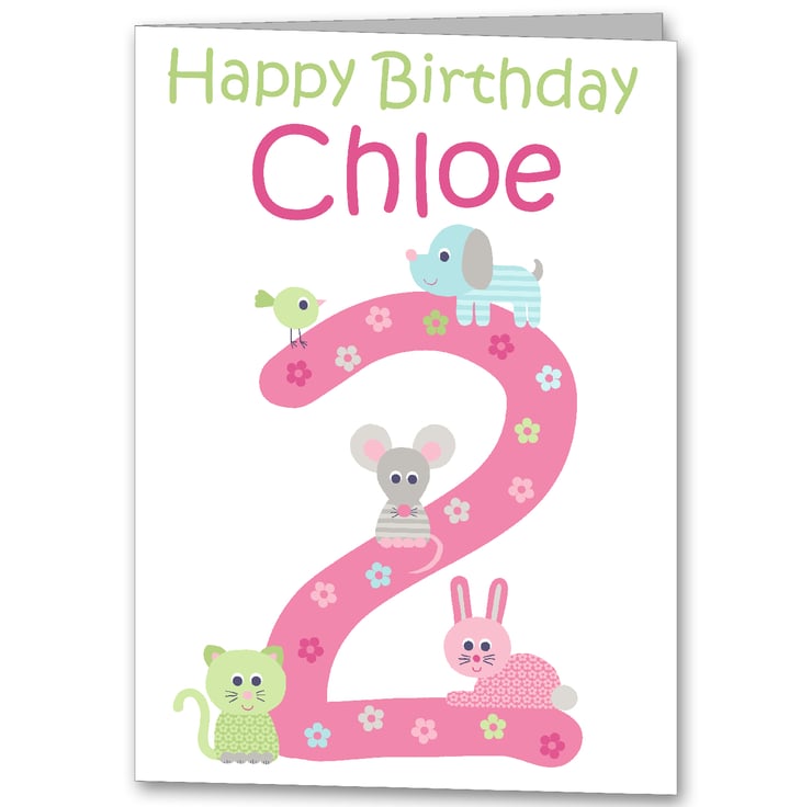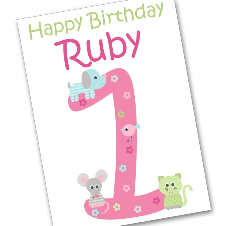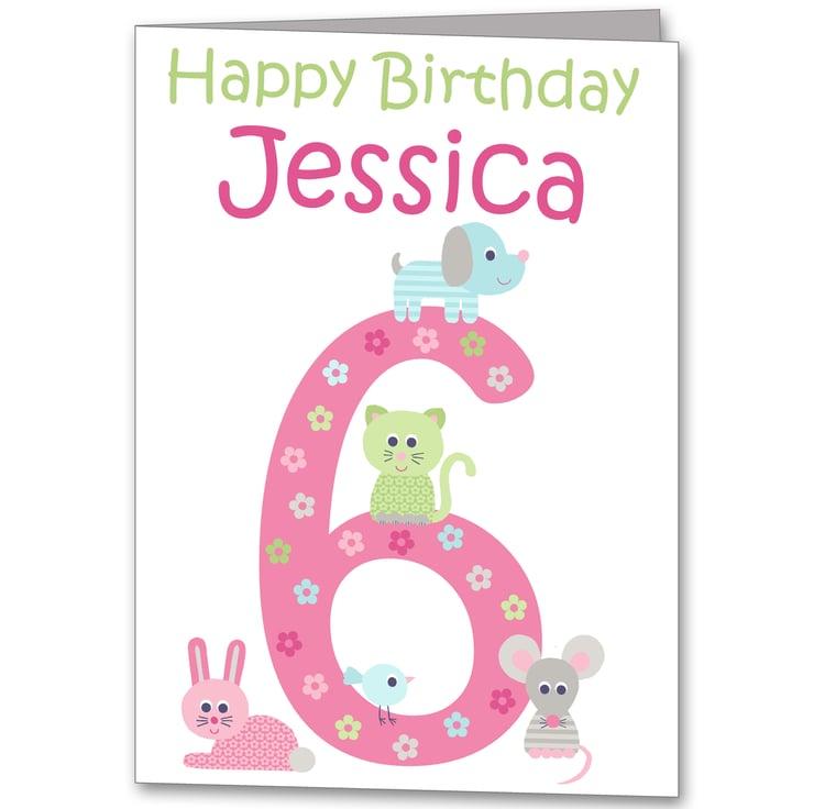 This cute girls animal birthday card features a puppy, kitten, mouse, rabbit and bird playing happily around the recipients age. It is printed especially for you with any name and any age you require.