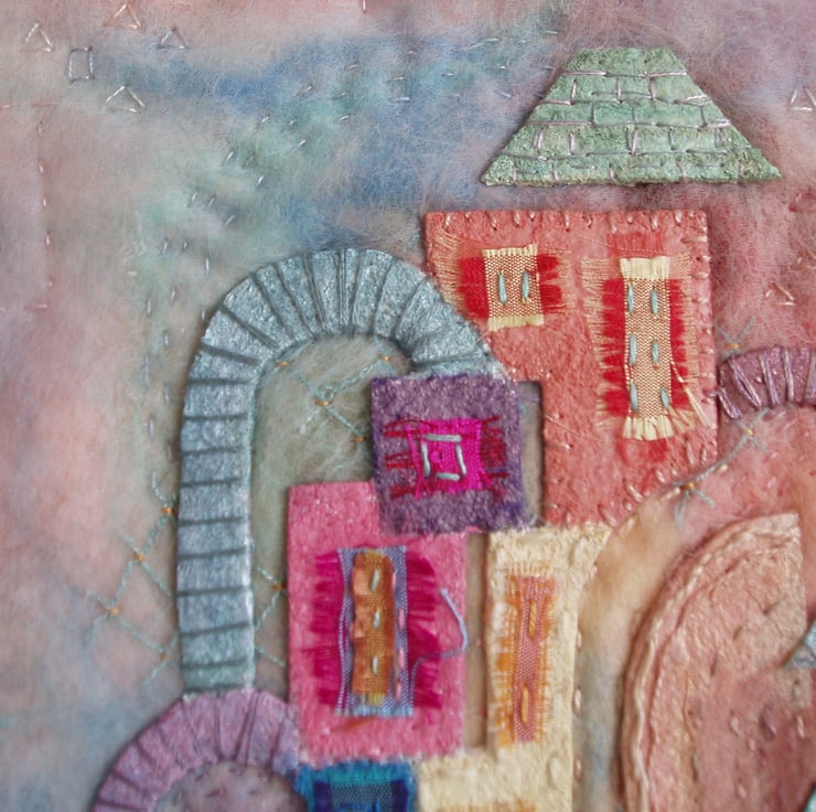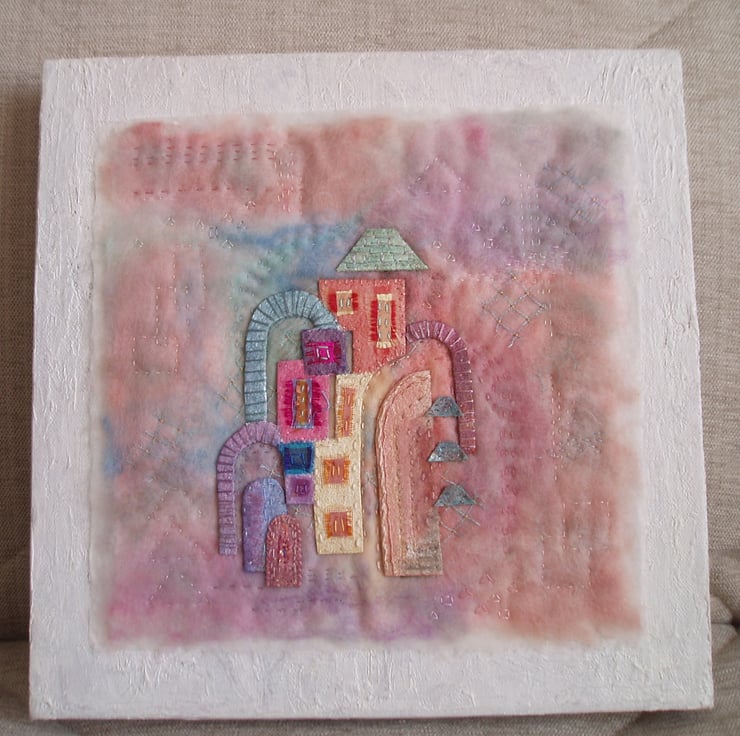 Appliqued shapes echo the designs and colours seen in the buildings at Portmeirion. Some of the shapes have been painted with acrylic paint and some are silk . They have then been applied with hand stitching to a handmade felt background. More stitching on the background echos the designs. The buildings are many colours including turquoise, peach, pink and lemon. The textile has been mounted on a painted textured canvas.