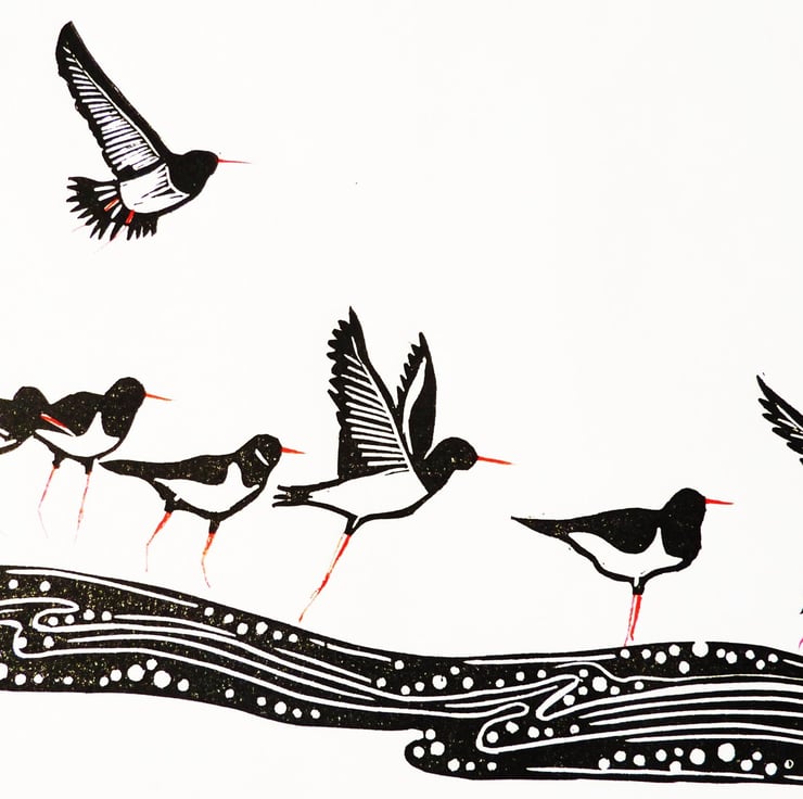 This is an original lino print printed with black oil-based ink onto Zerkall Printing Paper and then finished with by hand with 11 little beaks and 22 legs in red acrylic ink!