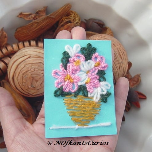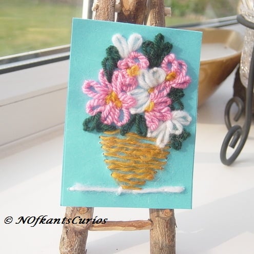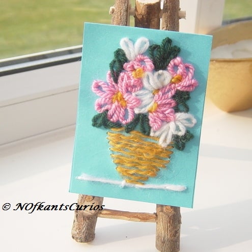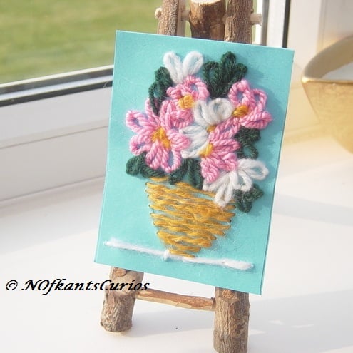 Pink Flowers is a mixed media ACEO, featuring embroidery sewn to a backed card, to ensure minimal cotton and yarn workings can be seen from behind.