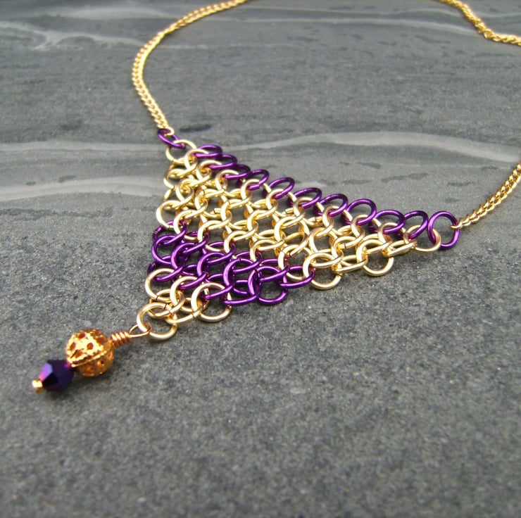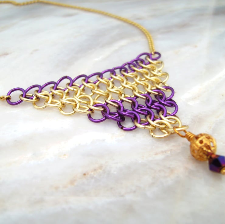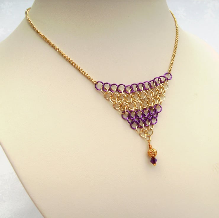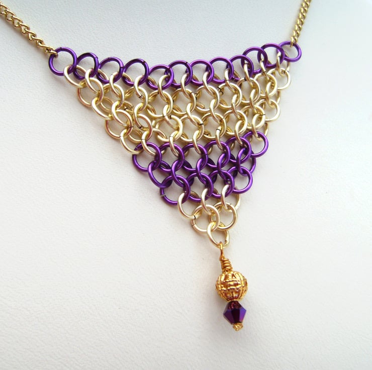 This 18 inch necklace has been created using enamelled violet purple & gold copper jump rings, woven together in European 1 in 4 pattern, completed with gold plated chain, filigree bead & crystal bead. Price includes a gift box.