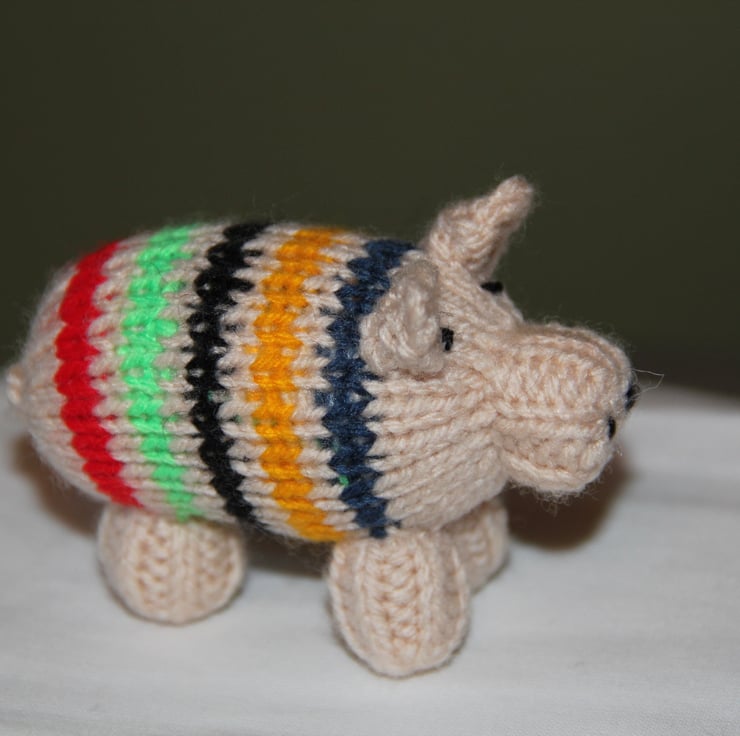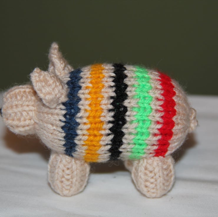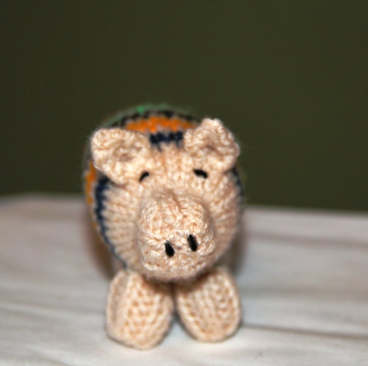 Olympig is looking forward to celebrating everything sporty this year, with his colourful Olympic ringed back he will join you in supporting your favourite team, whether you take him to the stadium or sit him on the telly . Olympig is 5 cm tall and is 9 cm from his snout to his wiggly tail. Olympig has no sharp or loose parts; everything is stitched. Because each Olympig is knitted individually, your piglet will be unique. . All profits from Olympig will go to Charity.