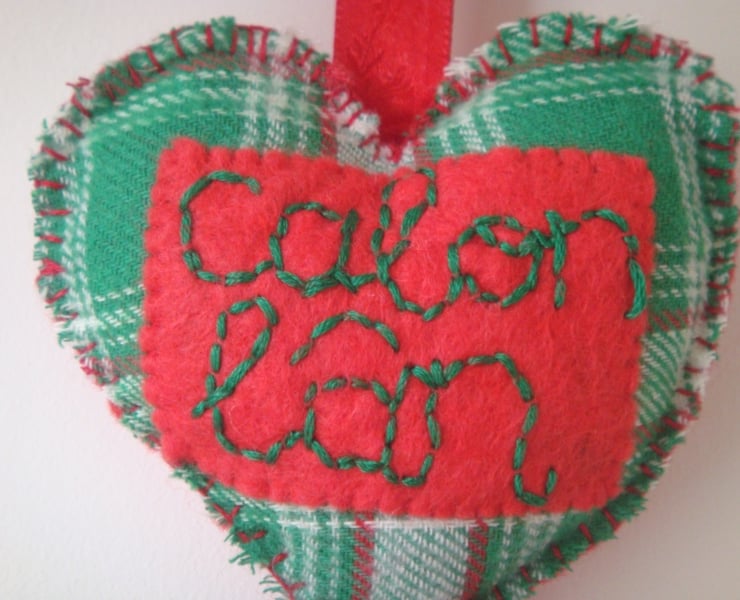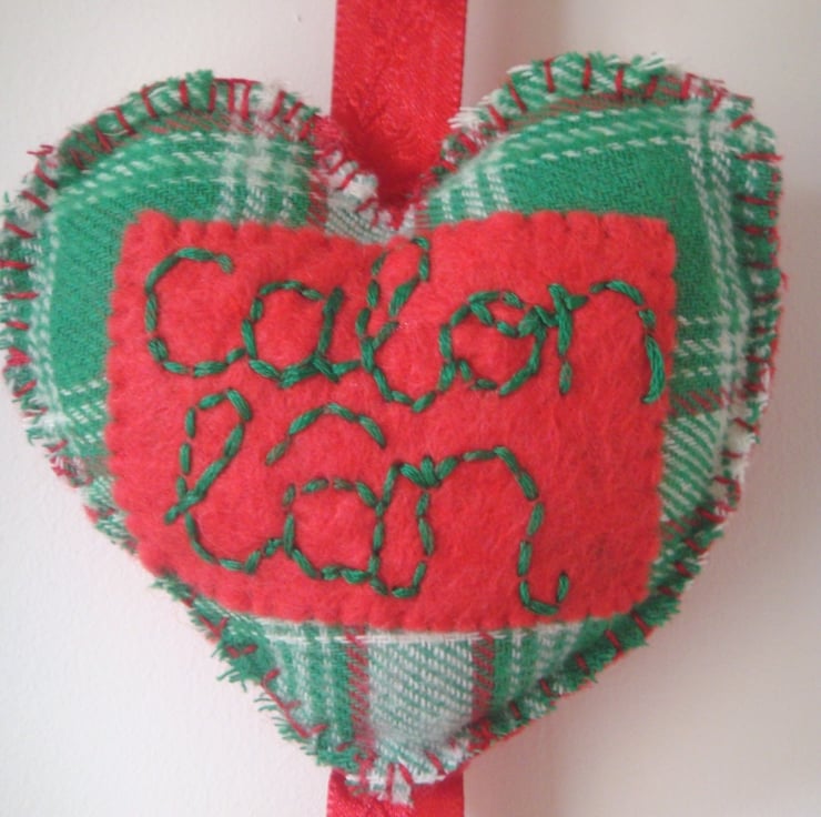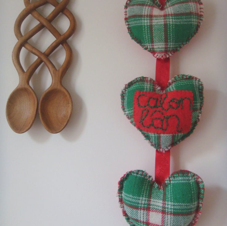 The central heart is adorned with the words ‘Calon Lân’ (Pure Heart) embroidered in green onto red felt.