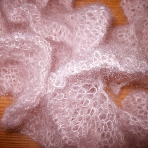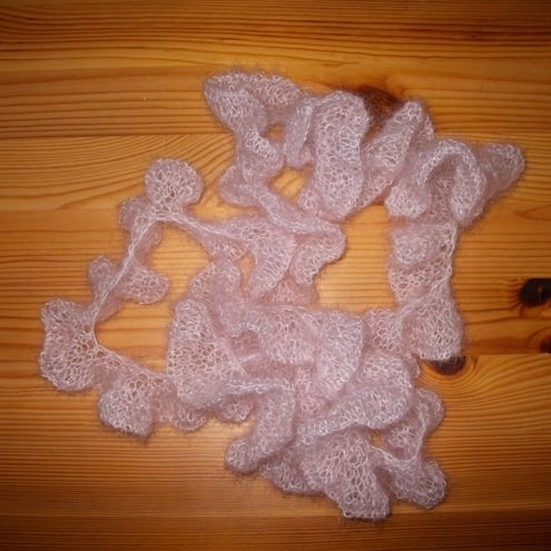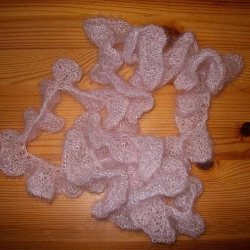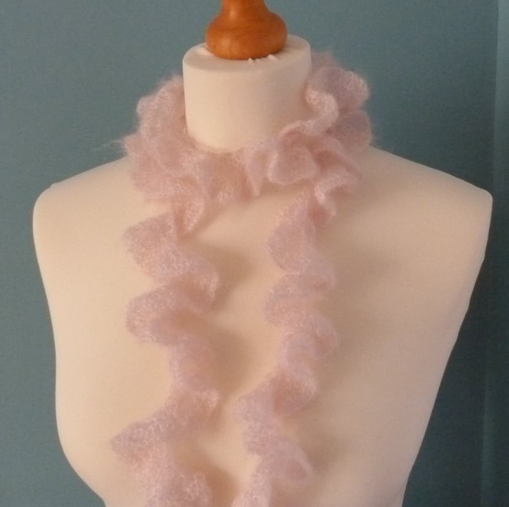 I have hand knitted this beautiful ruffle scarf in a pale pink colour, from Rowan Kidsilk Haze. This is a fantastic soft yarn, which is a mix of 70% super kid mohair and 30% silk. The finished length of the scarf is 52".