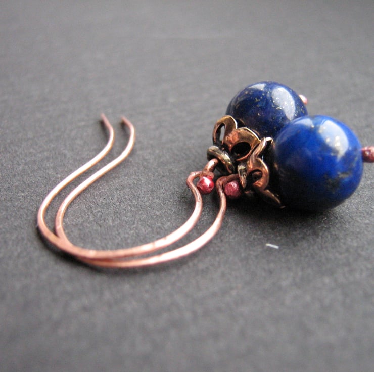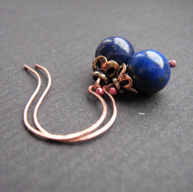 Gorgeous lapis lazuli beads (8mm) of royal blue flecked with gold adorn handcrafted ear hooks to make these stunning drop earrings. The copper hooks have been hand fired by myself to produce the decorative balled ends, then shaped and hammered to harden before polishing up to a shine finish.