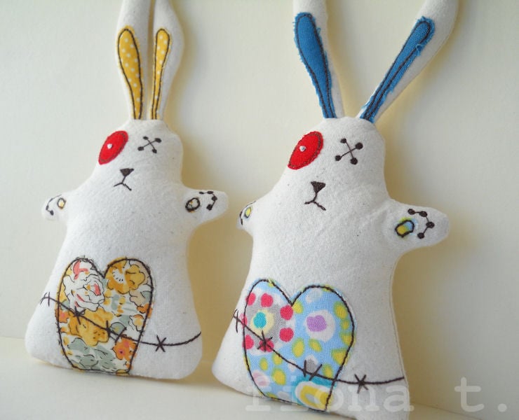 they’re made from heavy weight calico, stiffened with vilene and backed with medium weight calico. i pre-wash all my fabrics so they’re soft and shouldn’t shrink – although i wouldn’t recommend putting these rabbits in a washing machine.