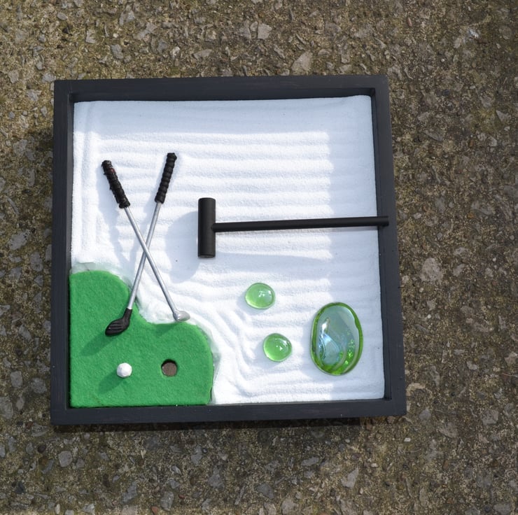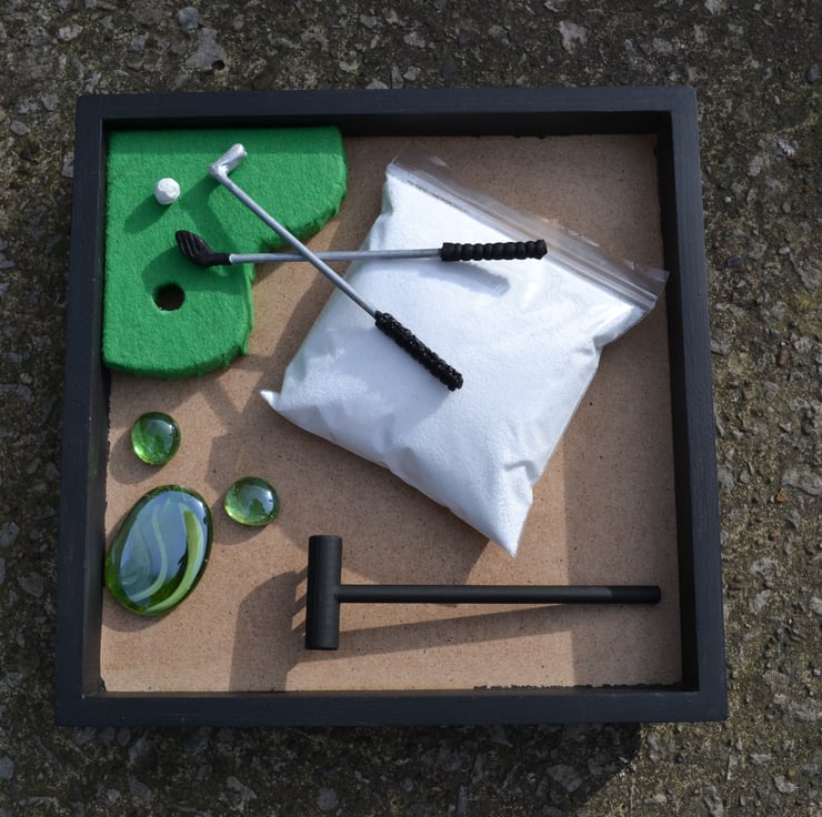 These delightful Golfing Zen gardens consist of a handmade wooden base with feet (available in a range of colours), which comes complete with hand-made golfing accessories, packet of pure white sand, 3 green pebbles and mini rake for raking your sand. Dimensions: 23cm x 23cm x 5.5cm (H). This Golfing Zen garden makes a unique and special gift.