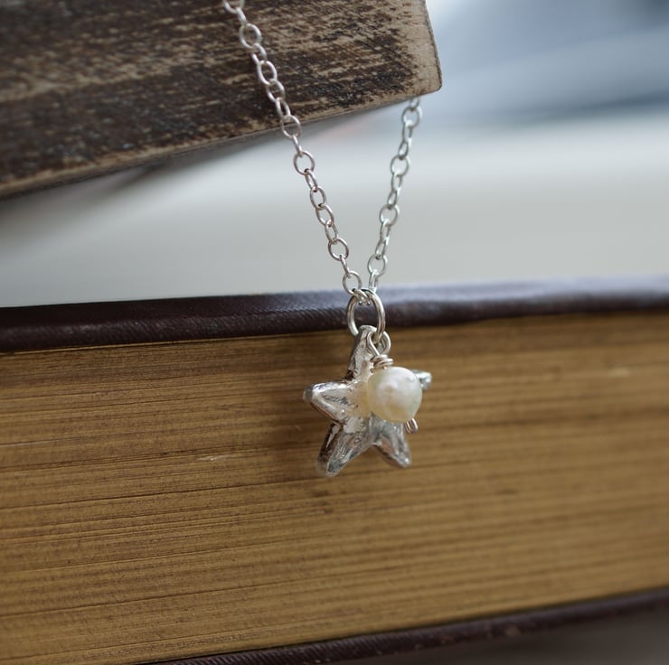 A beautifully shiny, fine silver, handmade star hangs from a delicate trace chain with a freshwater pearl.
