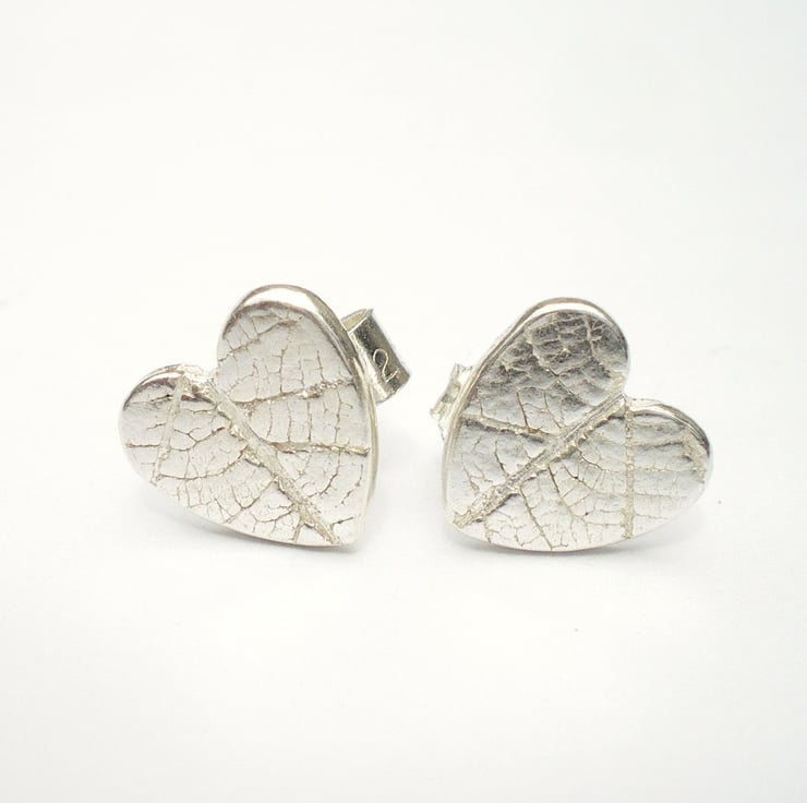 Tiny little silver heart stud earrings with a delicate leaf texture. They match my silver love bird pendant perfectly!