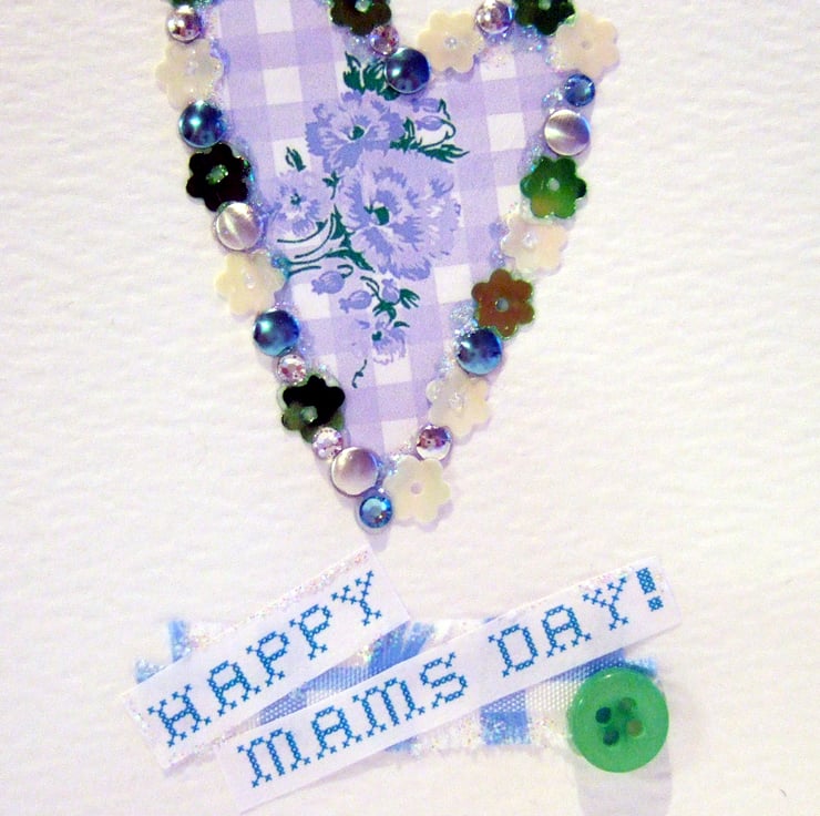 A pretty & unique designed card which consists of a patterned heart in the centre of the card surrounded by a mixture of flower sequins, nail head embellishments,glitter & swarovski crystals.