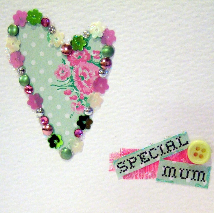 A pretty & unique designed card which consists of a patterned heart in the centre of the card surrounded by a mixture of flower sequins, nail head embellishments,glitter & swarovski crystals.