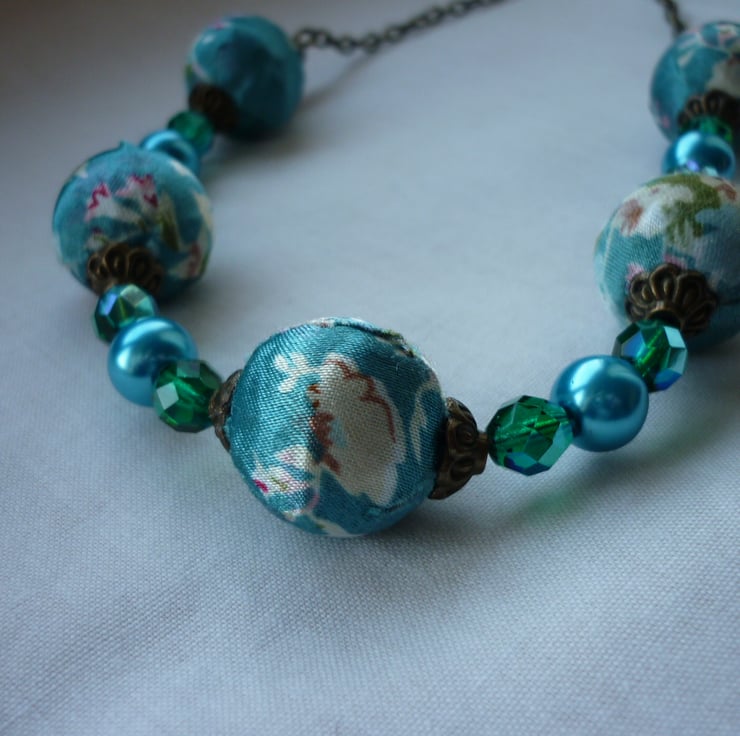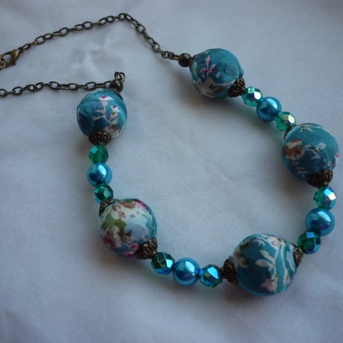 THE NECKLACE HAS BEEN MADE WITH SATIN BEADS IN THE FAMOUS KIMONO FLORAL DESIGN IN TURQUOISE ALONG WITH 10MM GLASS PEARLS IN TURQUOISE, 8MM FIREPOLISHED GLASS BEADS IN TURQUOISE WITH AN AB LUSTRE ON THEM, ANTIQUE GOLD FANCY BEAD CAPS, ANTIQUE GOLD SPACER BALL BEADS AND FINISHED WITH ANTIQUE GOLD TRACE CHAIN AND LOBSTER CLASP.