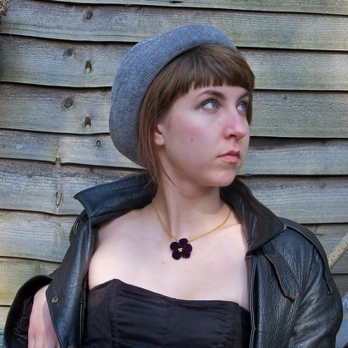 A violet in rich purple velvet on a short wire stem, hand-made using original Victorian flower maker’s tools by David Bloor, around the 1980s, possibly as pieces for a dress-maker or milliner, One of these forgotten flowers has now been rethought and re-crafted as the centrepiece for a necklace, by David's granddaughter Louise Bloor. Craft across the generations.