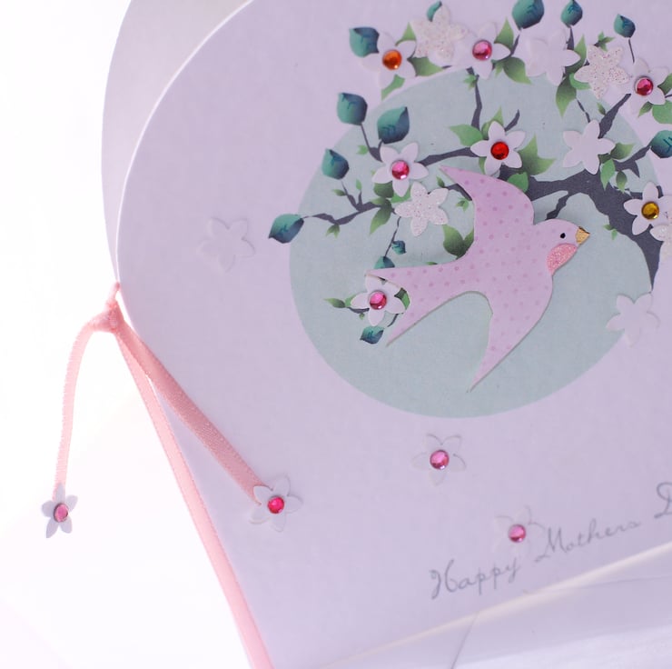The little bird has been handcut from pastel mauve/pink polka dot card and finished off with a sparkly pink cheek and a gilded beak. Sparkly glitter and white hammered card have been used for the blossoms which have been finished off with a sprinkling of diamantes.