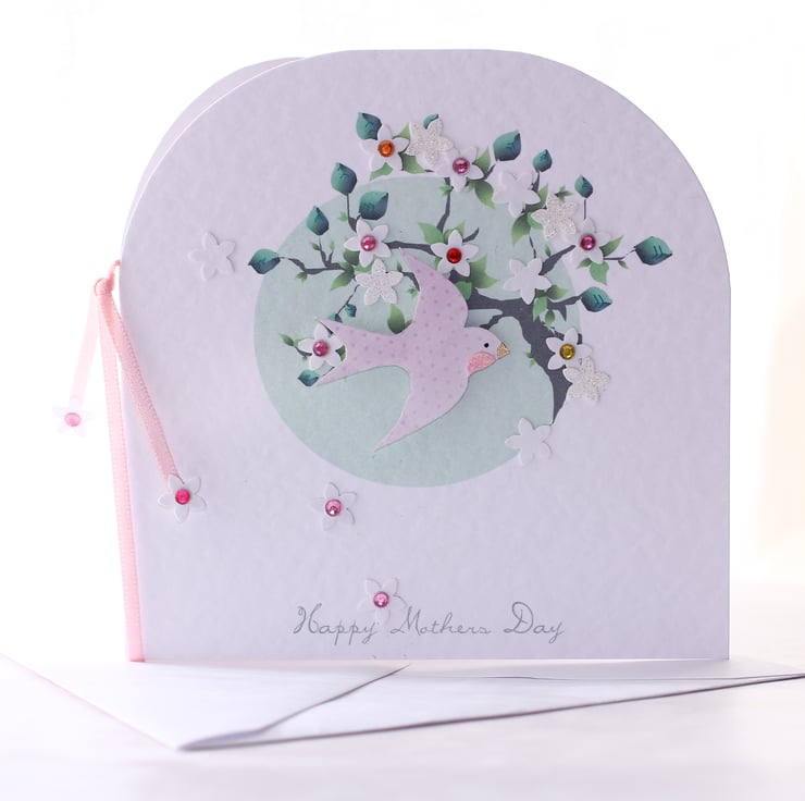 This lovely Mother's Day card features a swallow flying through spring blossoms.