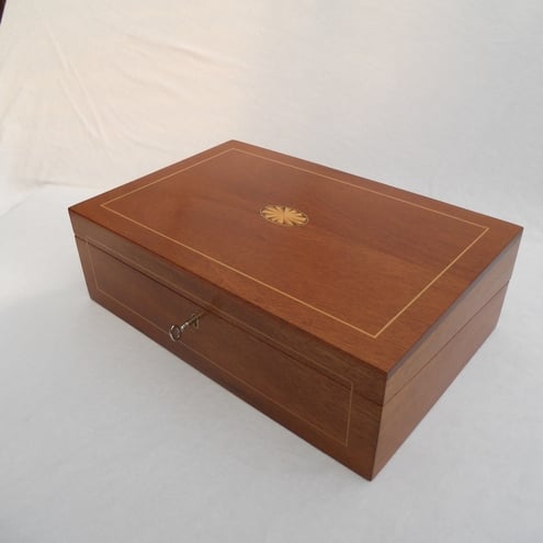 This Writing Slope is handmade in reclaimed solid mahogany with boxwood stringing and an inlaid centrepiece.