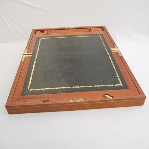 The interior has green leathered slope with gold tooling .There is storage underneath for stationery.