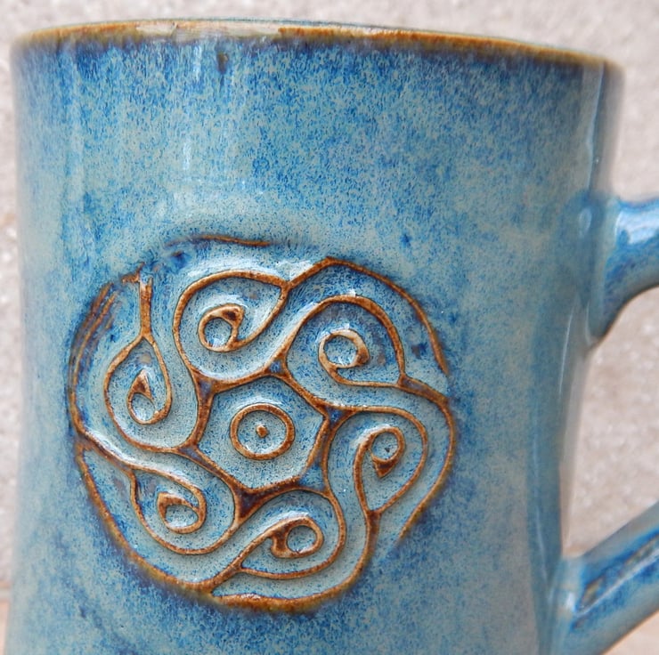 I have added a celtic roundel stamp to the side and finished it in a lovely dark aquamarine blue reactive glaze