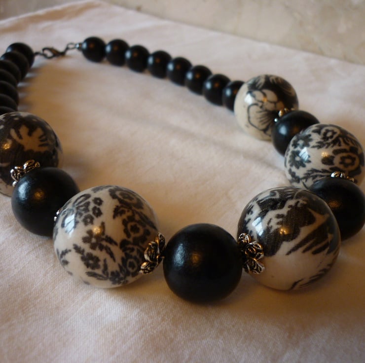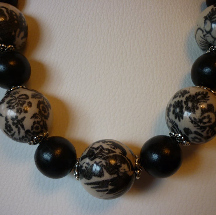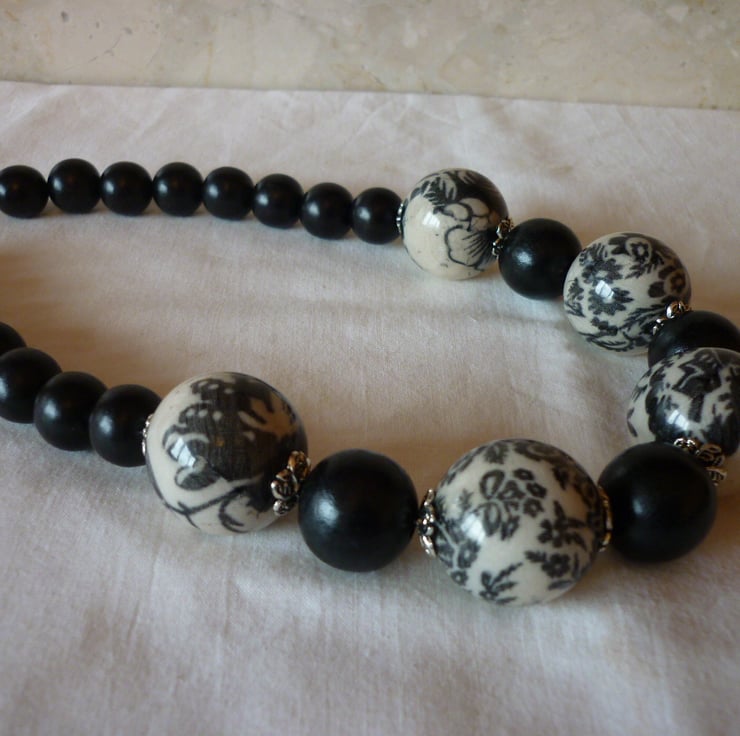 THE NECKLACE HAS BEEN MADE WITH LARGE CHUNKY LEIGHT WEIGHT ACRYLIC BEADS IN BEIGE WITH BLACK PATTEREN WITHIN ALONG WITH LEIGHT WEIGHT CHUNKY BLACK BEADS IN TWO SIZES AND SILVER PLATED FANCY BEAD CAPS AND FINISHED WITH A BLACK PLATED LOBSTER CLASP AND FINDINGS.