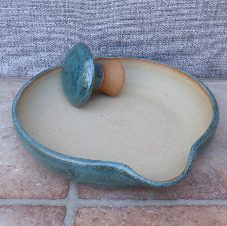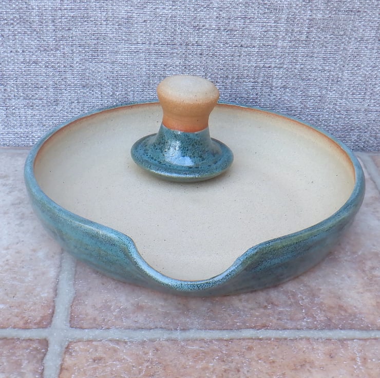 This dish was thrown on my pottery wheel using strong toasted stoneware clay, and I've finished it in a lovely dark forest green reactive glaze.
