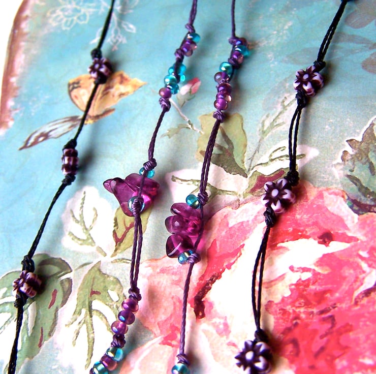 I knotted the flower beads onto a double length of macrame cord, which is silky and fine but very strong.