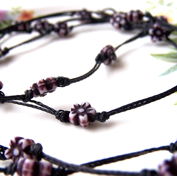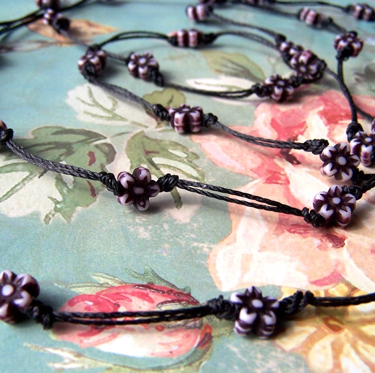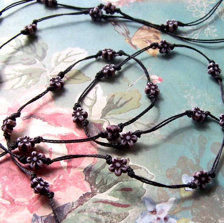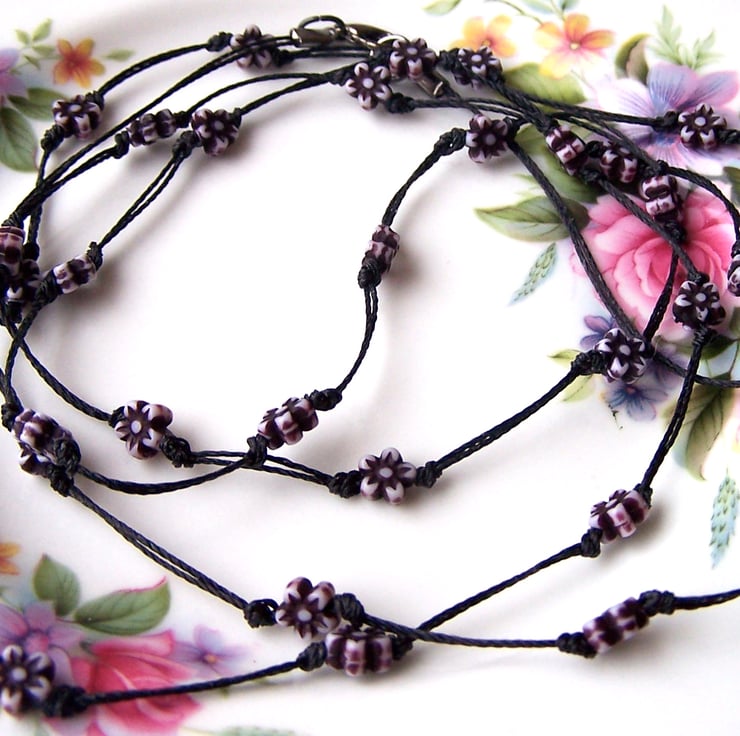 A pretty boho style necklace made using tiny grey black flower beads which I have knotted onto a double length of black macrame cord.