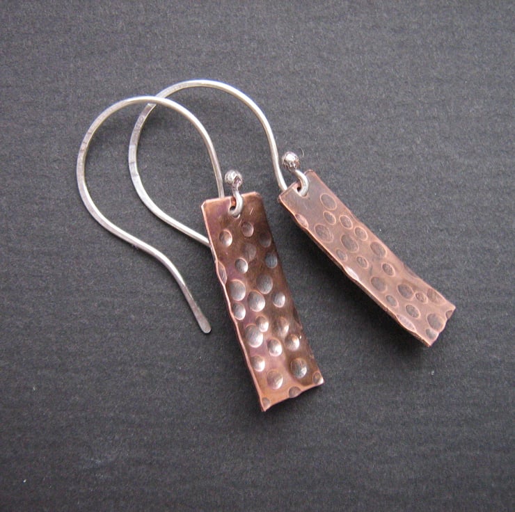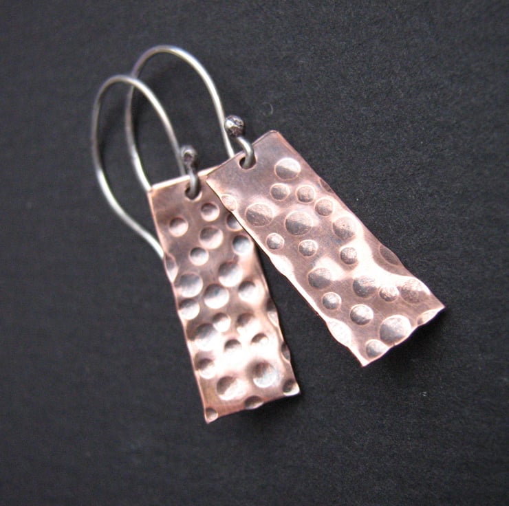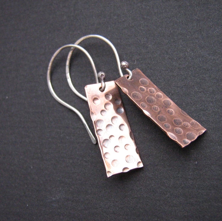 Strips of copper (22x9mm) were handcut and stamped to create this lovely bubble effect on the surface. Each piece has then been oxidised to highlight the pattern, before polishing back to a shine. I have coupled them here with handcrafted sterling silver ear hooks. The finished earrings have a 40mm drop.