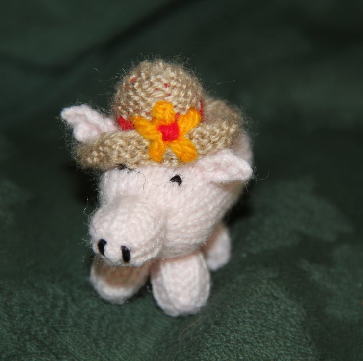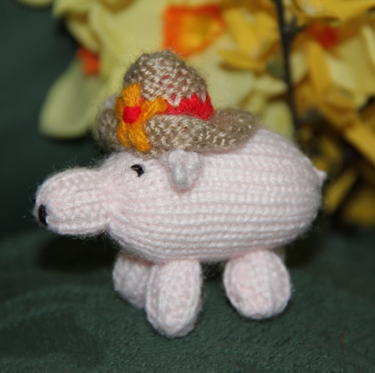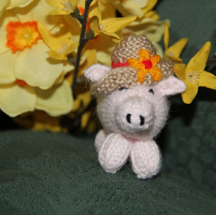 Bonnie is a sassy Spring piglet, hand knitted from my original design with love and care. She stands 6 cm tall from trotter to the crown of her bonny floral bonnet and is just 7.5 cm from snout to her wiggly tail. Bonnie has no sharp or loose parts; everything is stitched. Because each Bonnie is knitted individually, your piglet will be unique. Bonnie will make a lovely Easter gift – fewer calories than an egg - let her waistline be the chubby one this Easter. All profits from Bonnie will go to Charity.