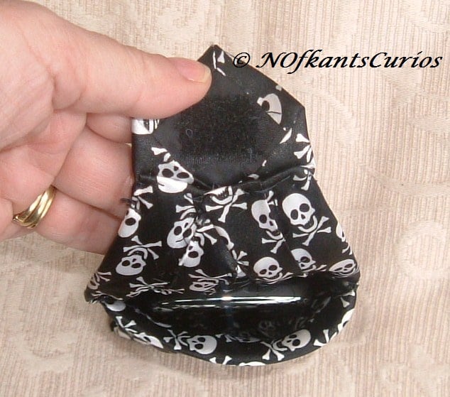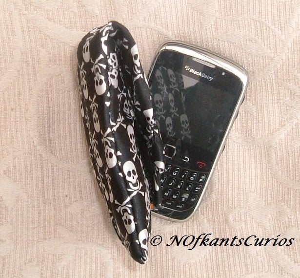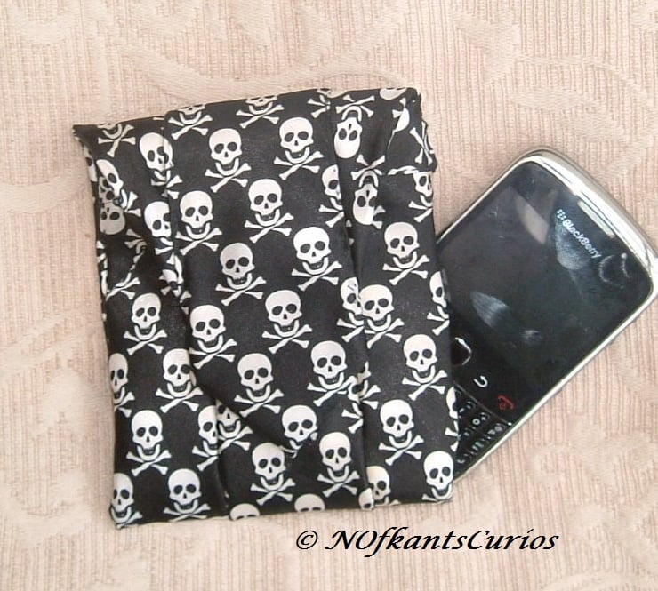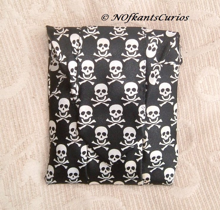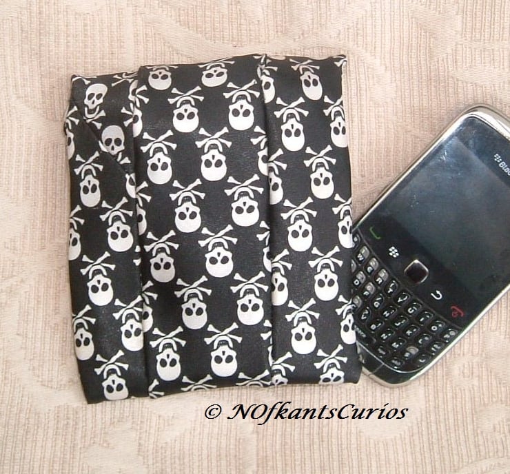 'Jolly Roger!' is a funky Gadget or mobile phone pouch, made from a single Gent's Neck Tie, in black with a profusion of white skull and cross bones symbols!