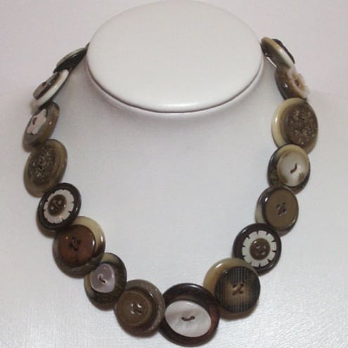 This distinctive button necklace is rich with an assortment of coffee, cream and brown buttons. These are threaded onto jewellery wire, which secures at the end with a silver plated lobster clasp fastener.