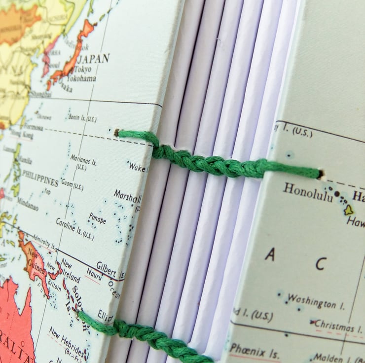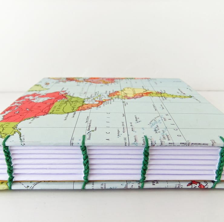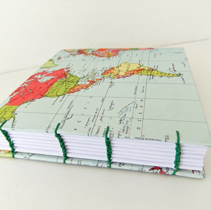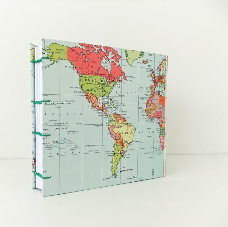 The covers of this gorgeous, hardcover, hand sewn journal are made with a wonderful, colourful map from a vintage Collin’s New Clear School Atlas. The covers show the map of the World. The journal has been made so that when you open it, you see the map of the whole world on the covers.