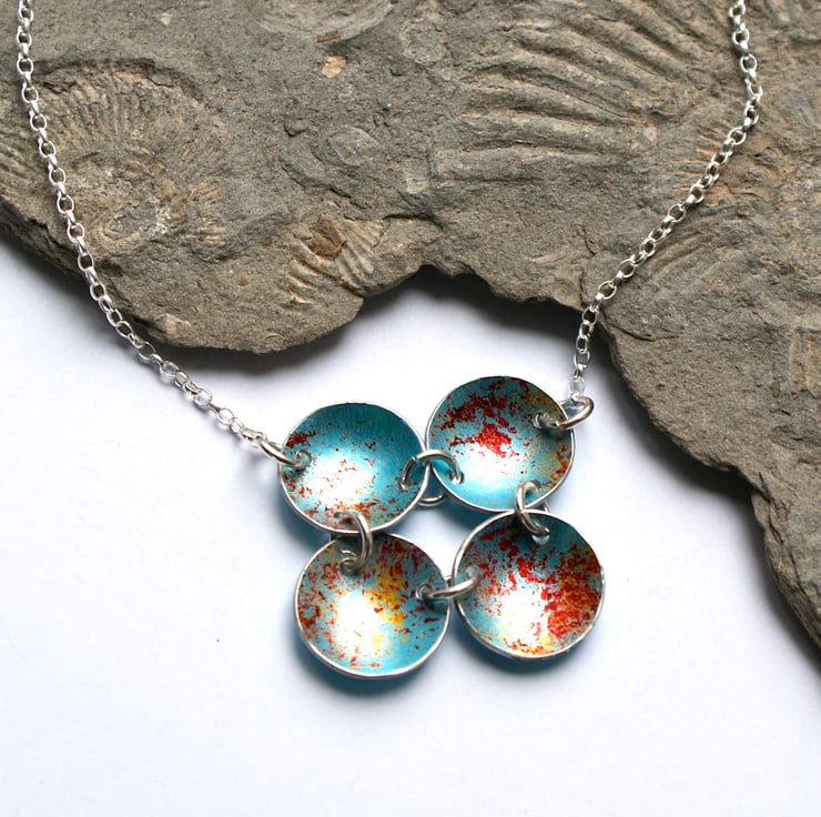 An unusual necklace with 4 aluminium domed discs hand painted in turquoise, gold and red. The discs are joined with sterling silver rings and a sterling silver chain. A perfect Mothers Day gift!