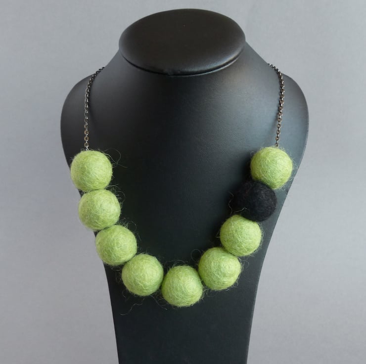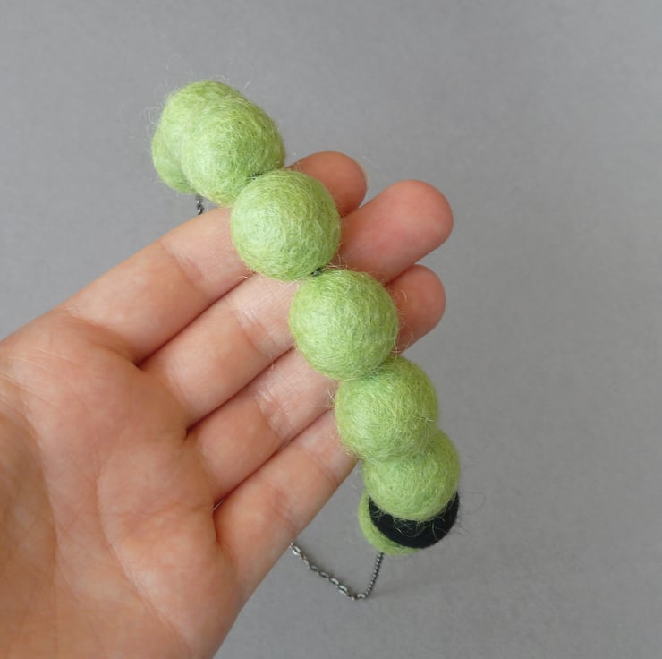This colour block, felt necklace is a great way to add a splash of colour to a plain outfit. These statement necklaces make a great gift for those who love fun, colourful jewellery. Eight olive green, felted balls have been punctuated with a single black felt bead and are spaced with black seed beads.
