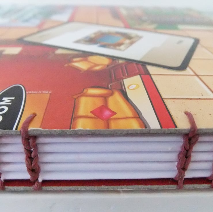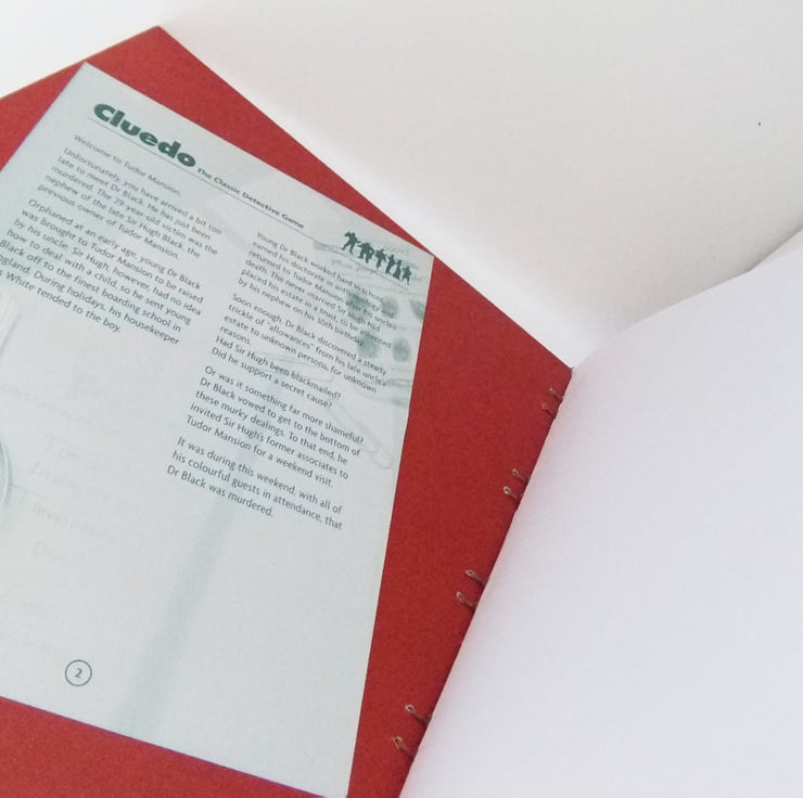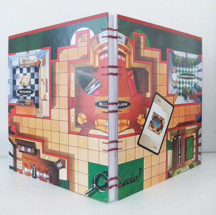 This listing is for ONE Cluedo notebook. Each notebook has been lovingly re-crafted from a rescued Cluedo board game from the United Kingdom. The front and back covers are made from a section of the game board and are sewn onto the paper with a coptic stitch. We have TWO large size Cluedo notebooks available: