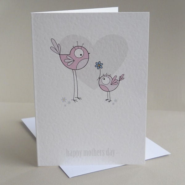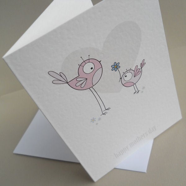 unique and quirky illustrated card in shades of dusky pink, featuring a little bird giving mamma bird a flower.