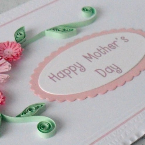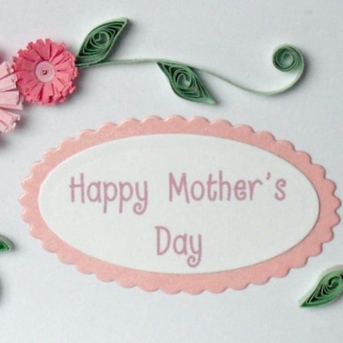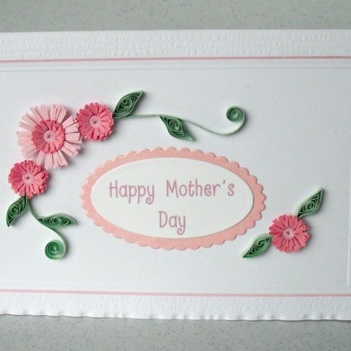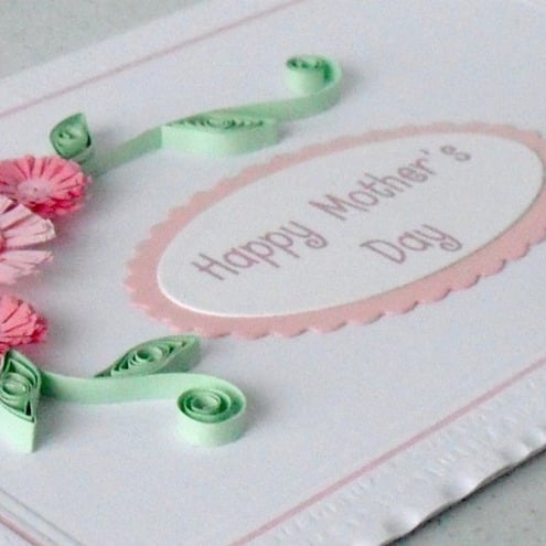 All the quilling on this card is handmade by me! Each petal, bloom and leaf is handrolled from strips of coloured paper. An arrangement of quilled daisies and foliage surrounds an oval scalloped panel, which reads Happy Mother's Day. The result is a beautiful original card which makes a great keepsake for the future.