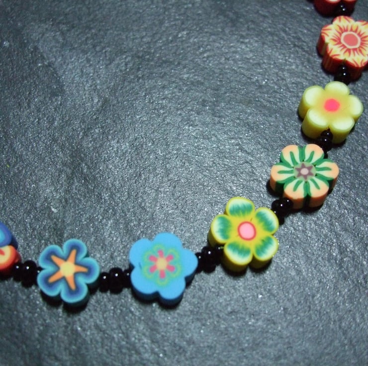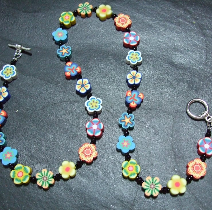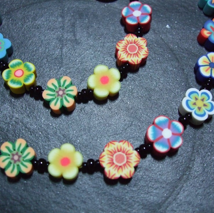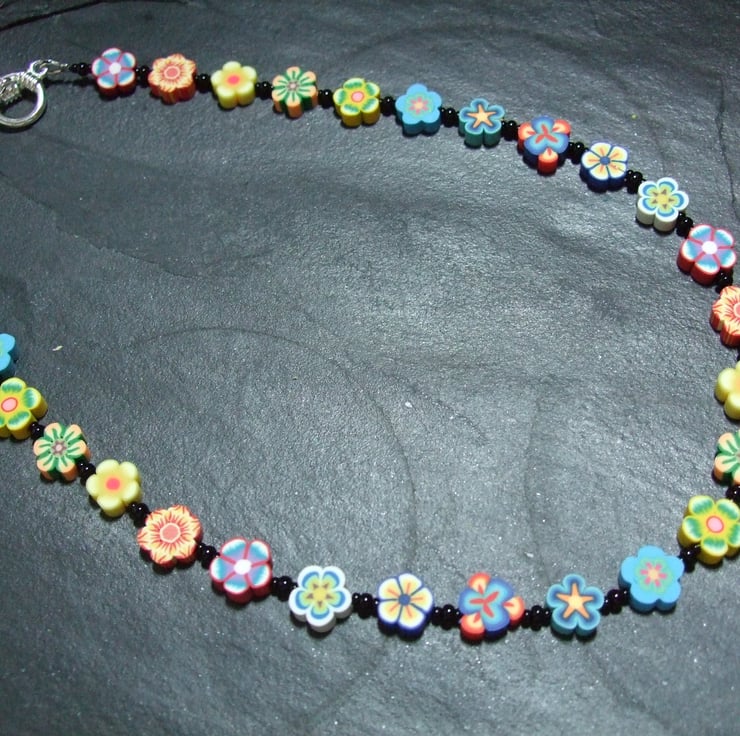 A cute, whimsical necklace from the Kitsch Creations Flower Power Collection, this item is lovingly constructed using miniature floral-themed polymer clay canes off-set to dramatic effect with the simplest black seed beads and high quality silver plated metal jewellery findings.
