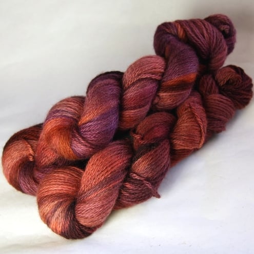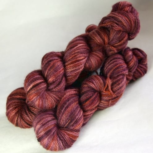 Yummy, soft Bluefaced Leicester yarn in shades of red, wine, burgundy, light aubergine, auburn and terracotta. These skeins have been dyed together, but have variations in blending and colour proportions so if you plan to use mmore than one in the same project, alternating skeins is advisable. There is one skein left. The yarn has been reskeined as shown in the first two photographs, but is shown in the third photo before reskeining for reference only.