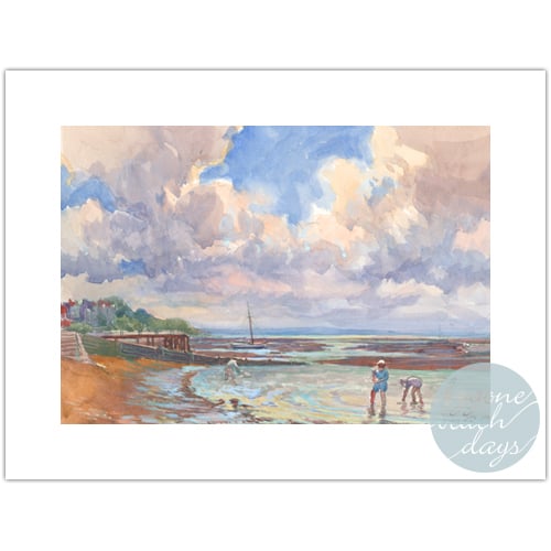 There are 8 watercolour paintings of beach scenes from the 1920's available. They all have amazing clouds and really give you a feeling of holidays or day trips to the seaside. This design is called SHRIMPING please see my other items for the other designs.