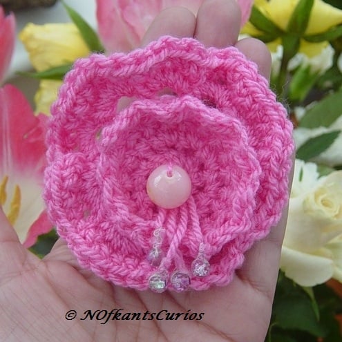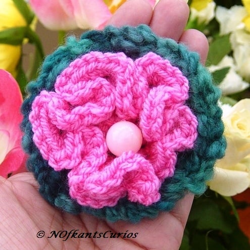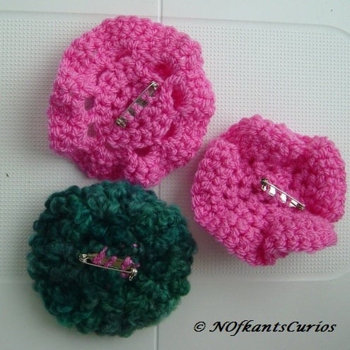 All three corsages are different, but crocheted in the same pink acrylic yarn, one with a moss green woolen backing yarn.