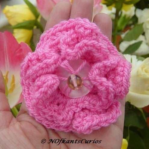 1. Double Ruffle Floral, with pink button and glass bead centre. SOLD