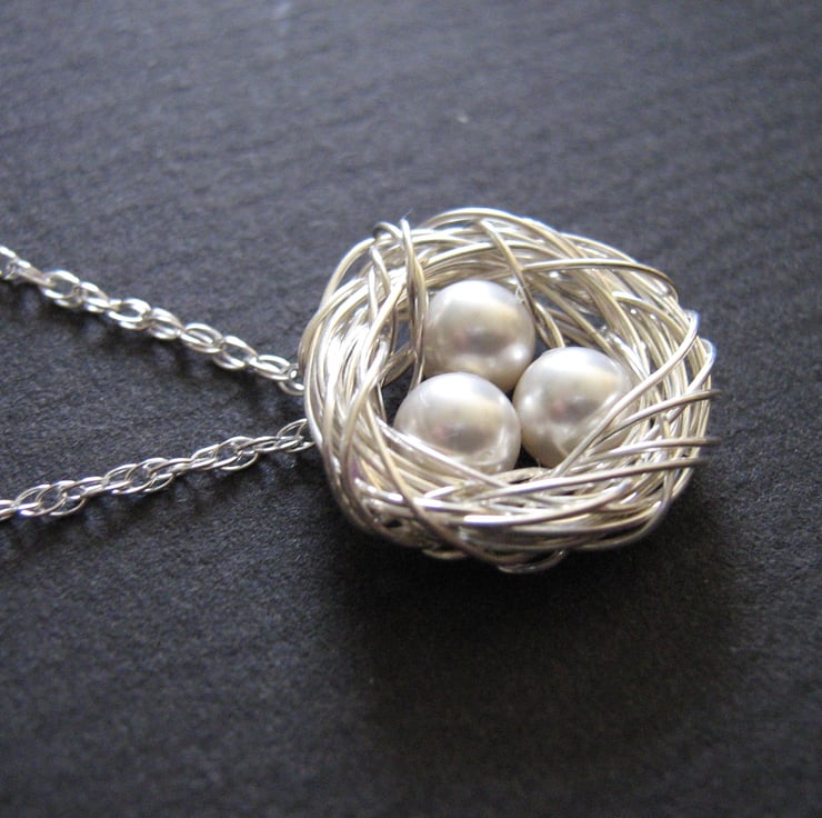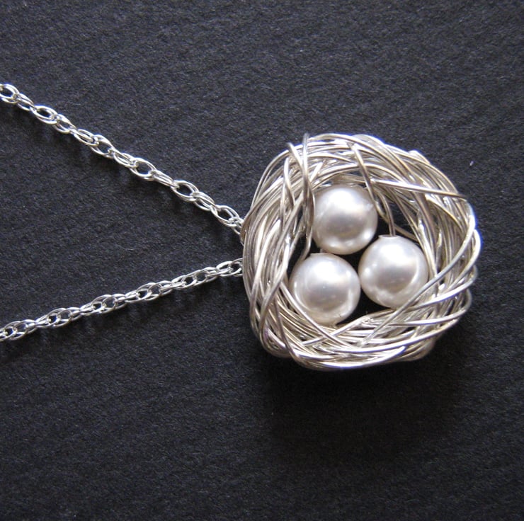 A stunning little pendant made of sterling silver wire wrapped and woven around three ivory swarovski pearls (5mm) to resemble a nest of eggs. The pendant itself measures approximately 18mm diameter, and comes with a sterling silver Prince of Wales chain, either 16 or 18" (please let me know upon purchase which you prefer). The pendant goes beautifully with my wire wrapped pearl earrings, and would make the perfect Mother's Day gift for children who've 'flown the nest', or even for bridal jewellery.