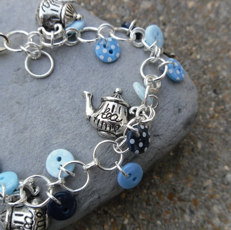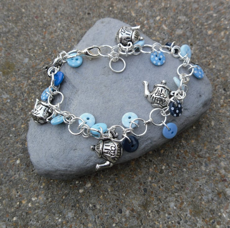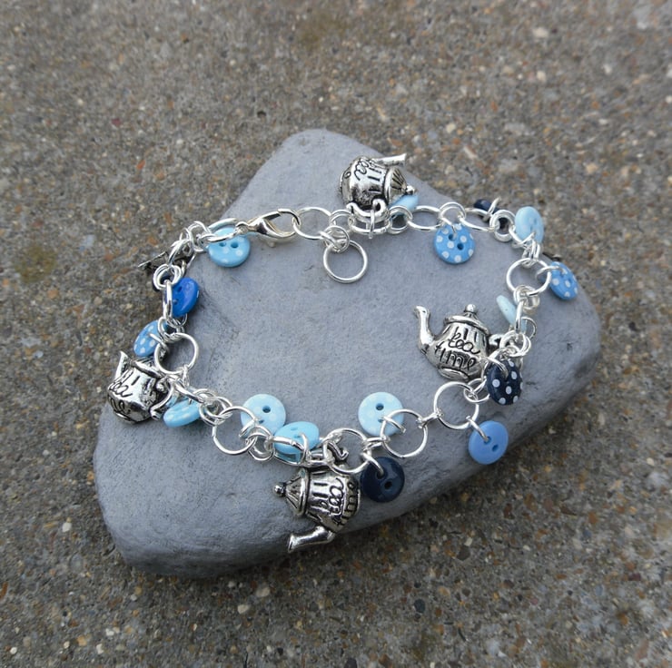 Handmade bracelet chain with tiny spotted blue buttons and teapot charms.