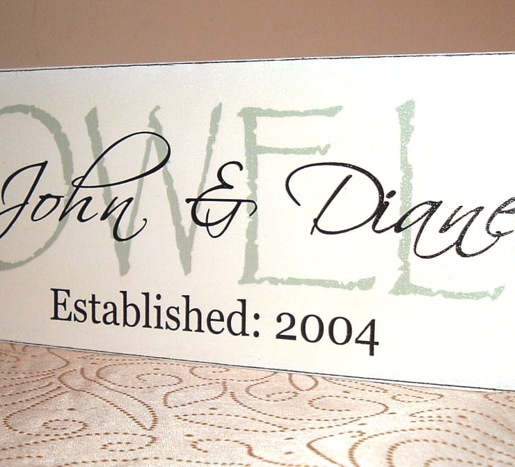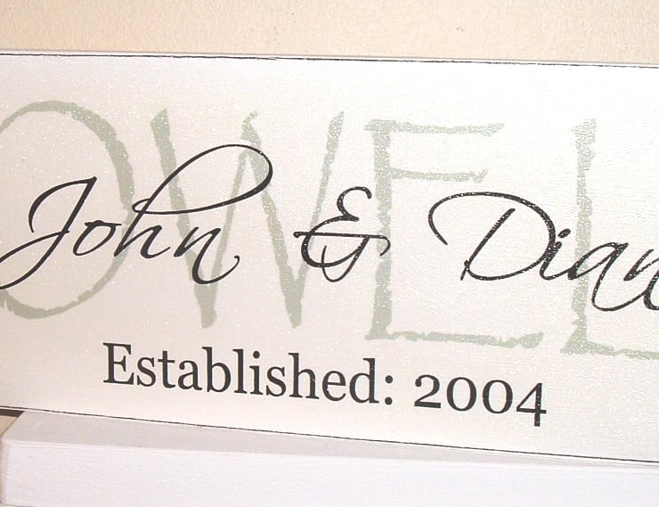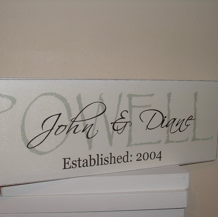 Lovely wedding gift personalised plaque, approx 12 x 4 inch antique white with bluey green surname-can amend the colour if wished and charcoal names and date. sawtooth hanger supplied thank you